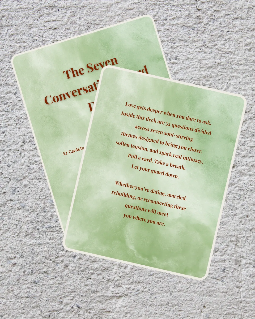 More than a card deck, it’s a relationship ritual in a box. Designed for sacred conversation and soulful reflection, The 7 Conversations Card Deck invites you to go beyond small talk and step into deeper connection.
